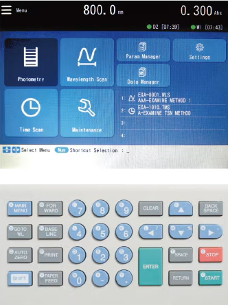 The UH5200 features a 10.4-inch backlit color LCD display with 800??600-pixel resolution - higher than the previous-generation U-2900 system???to allow detailed visualization of calibration curves and measured spectra. The layout of the display screen is unchanged from that of previous-generation instruments, offering users a familiar operating experience with enhanced readability thanks to a new graphic design. A dedicated keyboard allows accurate, worry-free input. (Figure 1)