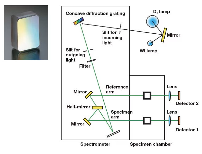 The optical systems of UH5200 instruments use Seya-Namioka monochromators, a widely used type of monochromator based on a concave diffraction grating (Figure 3). Concave diffraction gratings serve both to focus and to disperse light, thus allowing optical systems to be implemented with fewer mirrors. Reducing the number of mirrors in a spectrophotometer not only reduces optical losses, but also shortens optical path lengths, yielding a brighter optical system. Hitachi's proprietary ruling engine technology for fabricating diffraction gratings enables bright, aberration-free optical systems. In addition, the use of a double-beam optical system???in which half-mirrors are used to split the optical path into two segments, compensating for variations in optical energy, including from the light source - ensures measurement stability over long periods of time.