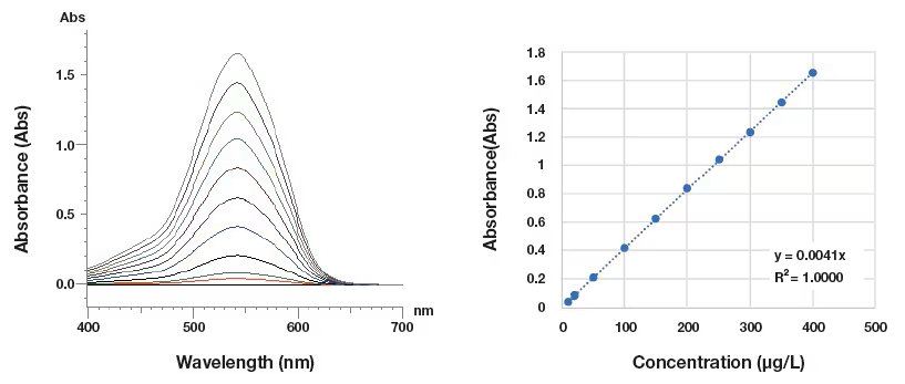 Figure 6 shows absorption spectra obtained in wavelength-scan mode (left) and a calibration curve obtained in photometry mode (right). For a peak absorption wavelength of 542 nm, the calibration curve over the range 0-400 ??g/L exhibits a perfect linear relationship with a correlation coefficient R=1.000.