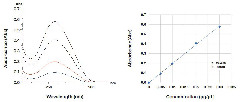 DNA exhibits an absorption peak at 260 nm, a nd the DNA concentration of a specimen may be determined by measuring the absorbance at this wavelength. This allows the use of spectrophotometers for quantitative analysis of DNA extracted from test bodies. Figure 7 shows absorption spectra for specimens prepared with various lambda-DNA concentrations (left) and a calibration curve for quantitative analysis (right), measured using a 50 ??L cell. We obtain high-quality spectra with absorption peaks near 260 nm. For measurement of trace specimens, the optional microsample cell may be used to measure specimen volumes as small as 1.5 ??L.